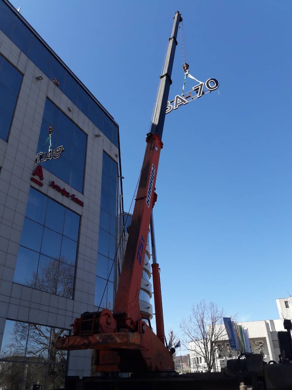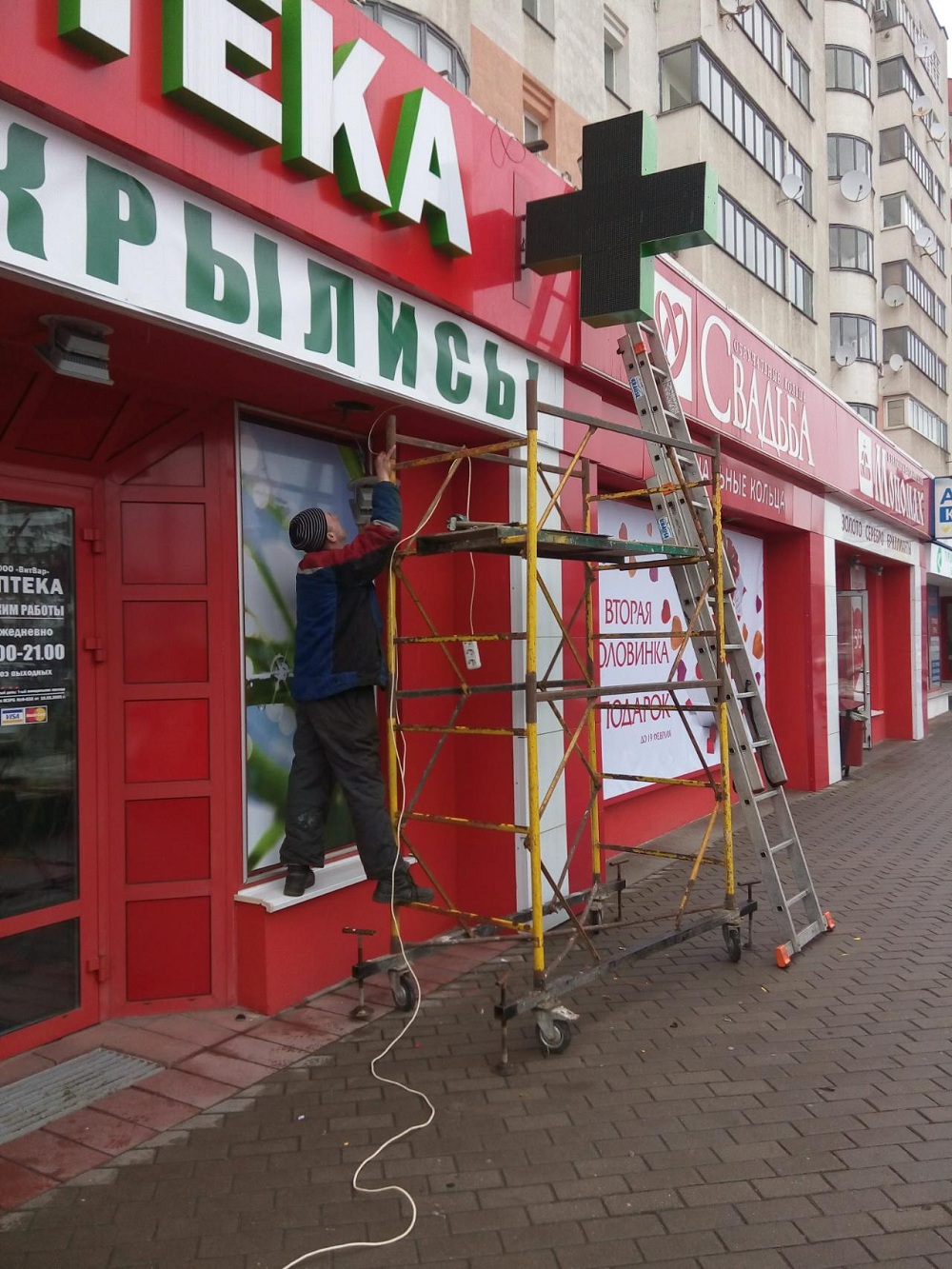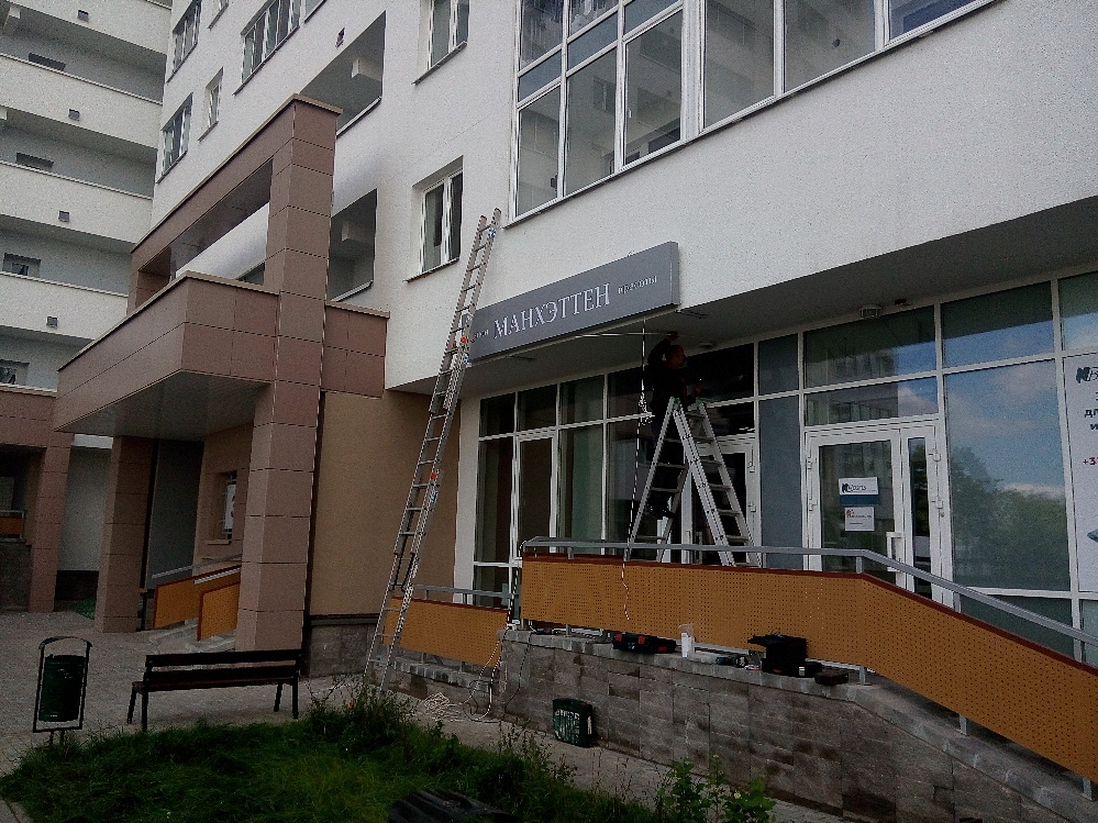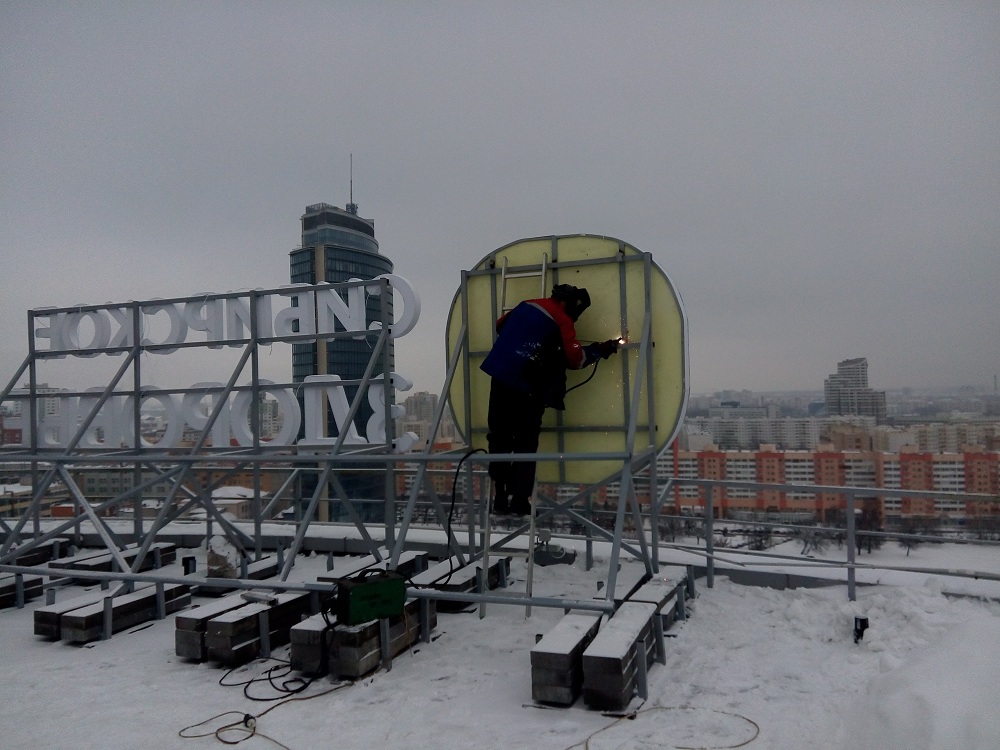 Наработанный нами опыт работы и квалификация монтажников позволяет выполнять монтажные работы любой сложности, в том числе резка, сварка элементов металлоконструкций непосредственно на обьекте, подключение электропитания к вывеске.